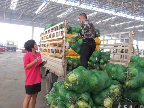 寿光农产品物流园由于其优越的地理位置以及政府对其支持,已逐步形成中国最大的蔬菜集散中心,价格形成中心,信息交易中心,物流配送中心,在国家乃至国外都受到极大重视。调研团队一行人到达物流园恰逢一车甘蓝发往至江苏,随即调研成员和负责这车甘蓝运送的师傅聊了起来。通过司机师傅对我们的介绍,我们了解到整个物流过程的简要步骤,以及在蔬菜长途运输中所需要的注意事项,因为路途较远,蔬菜保鲜就成为了一个非常重要的问题,如何在保证蔬菜质量的前提下确保蔬菜的新鲜,针对这个问题调研成员提出了自己的几点建议,而这几点建议也正是在运输过程中物流园常常采用的办法。