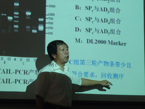 马汇泉教授进行了题为《Bacillus cereus B-02拮抗作用相关基因的克隆及其表达》的学术报告。马汇泉教授首先为大家介绍了此项科学研究的背景,由于番茄灰霉病一直给番茄种植带来巨大影响,且长久以来一直依赖化学农药进行防治,因其见效快、省时省钱等优点颇受青睐,近年来由于其对环境的负影响凸显,生物防治技术逐步引起了人们的重视,但是关于拮抗机制研究尚不够成熟,一直没有发挥最大效用,目前探讨生防菌株的拮抗基因及其调控机制为当今热点。马汇泉教授及其研究生就利用转座子标签技术获得片段DJ-T02,并利用TAL-PCR对其片段侧翼未知序列进行扩增。通过专业软件对引物进行选择。5’-end端侧翼序列TAL-PCR结果显示,第一轮结果显示不好,只有第二轮以及第三轮结果较好可以进行回收。接下来,马汇泉教授讲解了关于MZ-BcP的生物信息学分析,其同速运芽孢杆菌同源率达到95%,关于ORF(585bp)翻译后蛋白序列分析、Mar蛋白家族结构域、ORF(585bp)克隆等方面,马汇泉教授均作出细致讲解。为验证ORF(585bp)与Bacillus cereus B-02关系,进行重组表达载体的构建,将含有重组体的大肠杆菌进行不同时间的诱导,空载体pef-32a(+)表达蛋白分子量约为20kd,推算目的蛋白分子量约为42.3kd,诱导物在培养4h后目的蛋白表达量最高。马汇泉教授及其研究生将基因初步定为在Bacillus cereus B-02内含质粒上,他们将深入研究如何调控、提高生理活性。
