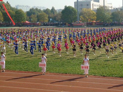下面,带给大家的是精彩纷呈的文艺表演赛,首先出场的是跆拳道社团。伴随着激昂的音乐,他们排着整齐的队列出现在赛场上。他们的招式饱含力道而不失美感,成为赛场上一道亮丽的风景线。而后是教职工广播体操表演及中国传统武术表演。教职工们用认真的态度和辛勤的汗水将广播体操化为一曲运动的赞歌,激励着同学们生命不息,运动不止。舞龙、舞狮表演如火如荼,让同学们热血沸腾,切实感受到了中国传统武术与文化的魅力。随后由啦啦队带来健美操表演。来自各学院的姑娘们在赛场上旋转、跳跃,尽情的挥洒青春的汗水。轻快的音乐,灵动的身影,让每一颗年轻的心为之沸腾。伴随着大家的热情与欢呼,本次运动会开幕式圆满落下帷幕。