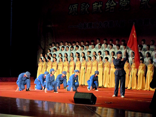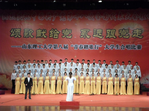 《红旗颂》、《我爱你中国》、《阳光路上》……一首首脍炙人口的歌曲,一页页动人心魄的篇章,我校大学生以自己的方式为祖国呐喊,为党颂扬,最后,本届合唱比赛在大学生合唱团演绎的《走向复兴》中胜利闭幕。