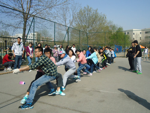 比赛开始,每支队伍的候补人员都自发地组成啦啦队,为参赛人员加油助威。四个比赛场地,每个场地呐喊声、欢呼声此起彼伏。生命科学学院抽签决定对战商学院,当比赛双方进入指定场地,在各自规定位置蓄势以待时,工作人员核对人数之后,伴随裁判一声哨响,第一局比拼开始了。两边参赛队员一齐用力,男生个个都涨得面红耳赤,竭尽全力向后拉;女生也巾帼不让须眉,放下平时的淑女风范,使劲攥紧绳子,用尽全力,一阵僵持之后,第一局以商学院获胜结束。双方交换场地,准备就绪,在第二局,生命科学学院的啦啦队队员竭力呐喊:“一二,一二,加油,加油······”虽说第一局成绩不理想,但他们并没放弃,仍然竭尽所能,尽自己最大的努力去扳回局势,虽然最后没能进入下一轮比赛,但从他们憋得通红的脸上我们看到了他们的努力。