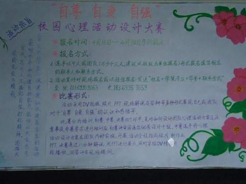 近期,由我院团总支承办的校园心理活动设计大赛于第二、三餐厅门口展开宣传。该活动主题为“自尊、自爱、自强”,旨在普及大学生心理健康知识,让大家思考自我,思考人生,拾起自信,打起精神,迎接大学的充实与精彩。