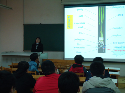 而后,赵凤云教授给以“MAPK调节镉胁迫水稻根系的生长机制”为题展开报告。赵教授在基因水平上介绍了根系的生长,并指出生长素的作用。她用技术实践中的例子和图式详细介绍了生长素对细胞周期的影响,使MAPK的调节机制更加清晰直观。同学们皆表示对生物技术表现出极大的兴趣,并认真做笔记,为今后在学习中不断拓宽研究领域奠定基础。