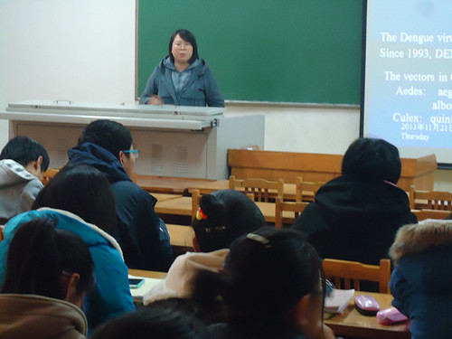庞秋香博士的精彩演讲之后,刘红博士的演讲方式让我们眼前一亮,全程中用英文的PPT结合中文的讲解,让大家找到了与国际接轨的感觉。开始,她向大家介绍了中国疾病预防控制中心与病毒预防控制所。而后,详细介绍了乙脑病毒、登格病毒等病毒的传播方式、分布范围及其造成的严重后果,让大家了解疾病机理,拓宽了眼界。最让大家感兴趣的是刘老师结合自身经历讲解的虫媒病毒的杂集方法、储存方式及实验方法,让我们更加想投入到实验研究中去。