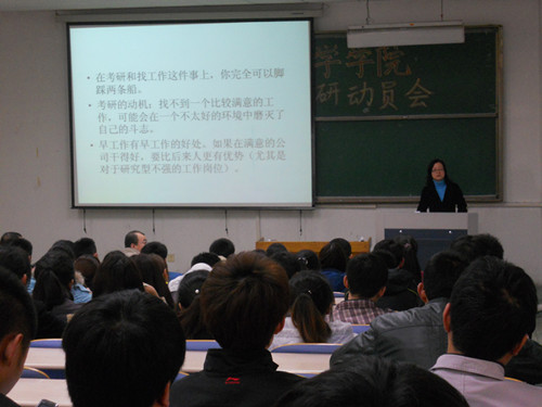 接下来,孟春晓老师针对“专业、学校、导师孰轻孰重”、“如何迈好专业学校选择第一步”等历年来本科生考研的各个误区为大家进行了详细的讲解。孟老师指出,考研和找工作并不冲突,同学们完全可以“脚踏两只船”。考研要结合自身的情况,不能用现在的水平衡量未来的成绩。程度不好的同学也不要妄自菲薄,要有尝试的勇气。她强调说,一定要有自己的想法,“随大流”是不可取的,考后调剂不如慎重报名,选择学校要避免“扎堆”。随后,孟老师综合考虑了11级学生的具体情况,给大家推荐了些较适合的考研院校并逐一分析利弊。孟老师的话精辟入理,使同学受益匪浅。