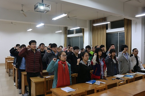 会议伊始,李娇娜向大家简要介绍了此次会议的主要流程,随后就习近平总书记在全国高校思想政治工作会议中讲话的主要内容,对青年学生应该做到的四个认识进行了具体介绍,并对我校第三次党代会的主题进行了回忆。要求各位团员认真学习四个认识,努力争做优秀共青团员。之后李娇娜又向大家介绍了我校党委书记吕传毅在党代会上提出的培养“五有”(有社会责任,有创新精神,有专门知识,有实践能力,有健康身心)高级专门人才的新要求。结合方志敏,冯思广,宋彦峤,孔凡厚,魏振文,张宏森,孙中伟,李进,王修文等人的具体事迹,加深同学们“五有”要求的认识和理解。活动最后,团支部全体成员起立,重温入团誓词。至此,活动结束。