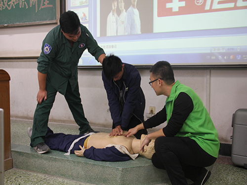 此次讲座采用PPT教学和现场实训相结合的方式,对心脏复苏术的关键操作步骤进行了详细的讲解,与此同时,岳巍利用模拟人偶进行急救操作演练,让同学们更好的理解急救方法。同学们积极踊跃的上台,依次体验胸外按压急救操作,各位医师就同学们的各种错误,如复苏前口腔异物的清理,按压时手的摆放位置、按压速度,复苏完成后的处理方法等细节问题进行了及时纠正。岳巍强调:遇到危机情况时要沉着冷静,把握好时间,牢记迅速、就地、准确、坚持的急救原则,使用正确的方法救治病人。