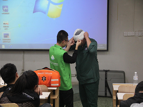 随后岳巍及其助手同学们演示了海姆立克法救治过程,对简单的止血包扎方法进行讲解并向同学们做出了伤口包扎示范。同学们认真学习,用手机记录下急救操作的正确方式。