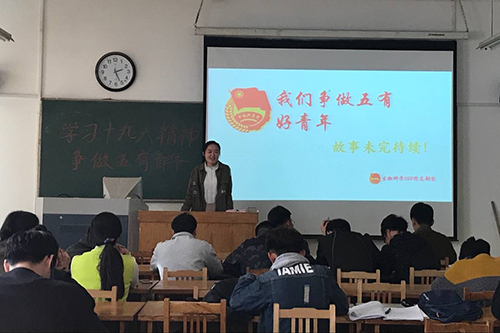 王新月就十九大报告的重要意义做了简单介绍,带领全体团员共同学习习近平总书记在十九大开幕式所作的《决胜全面建成小康社会夺取新时代中国特色社会主义伟大胜利》报告,并组织观看十九大开幕式视频;随后,团支部全体团员就十九大报告表达自己的感受,进行思想交流。王新月号召各位团员认真学习十九大精神,坚决拥护共产党的领导。