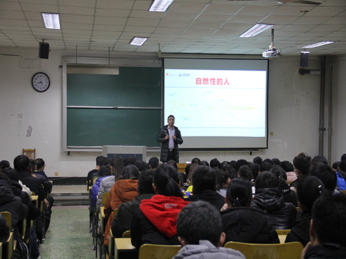 论坛开始,张晨采用PPT的形式对山东圣海保健品有限公司的基本情况做了详细介绍。随后,张晨结合自己的工作经验告诉同学们在选择职业时需要考虑自己工作的行业、公司、岗位三个主要问题,并从这三个问题入手告诉同学们该如何正确择业。他讲到:“不论在什么环境中,都有三类人,阻跑性的人、可燃性的人、自燃性的人,希望大家争做自燃性的人。”