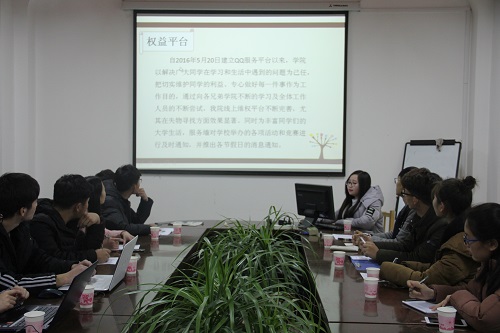 会议开始,刘泽凤对2017年度学院服务墙推出的权益维护情况进行了总结,重点就服务墙的寻物、失物通知、学校信息通知及创新活动进行汇报。接下来,根据班级同学反应的情况,各班班长提出如宿舍的故障报修、餐厅用餐、校医院就医等关于班级同学利益维护和权益问题。针对各班班长反应的问题,校学生会、院权益部与各班班长共同讨论,寻找最佳解决办法。