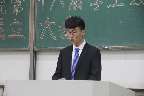会议伊始,翟静涛对十六届学生会较十五届学生会的三个优势进行阐述并宣读第十六届学生会全体人员名单,对第十六届学生会的工作开展寄予期望。接下来,刘洪洋从纪律约束、创新、保持初心三个方面进行第十五届学生会工作总结,强调学生会成员要做到“勇担责任,砥砺前行”。随后,第十六届学生会主席李海峰从热情、责任、制度、机会四个方面讲述第十六届学生会的工作计划,针对后续工作开展做出“不忘初心,发挥能力,勇于开拓,奋力前行”的承诺,并带领第十六届学生会部长宣誓。