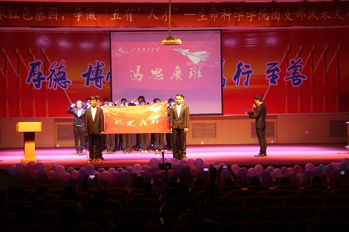 生命科学学院2017级八个团支部根据抽签顺序进行展示,展示环节由团支部PPT讲解,特色表演、合唱团歌三部分组成。“冯思广班”生物科学1702话剧《奋斗青年,传承英雄精神》,再现五四爱国革命运动情景,演绎“冯思广”精神,感染无数观众,给大家留下了深刻印象。表演过程中,同学们表情动作到位,感情丰富,赢得了台下阵阵掌声,彰显了“冯思广班”积极向上的风貌。