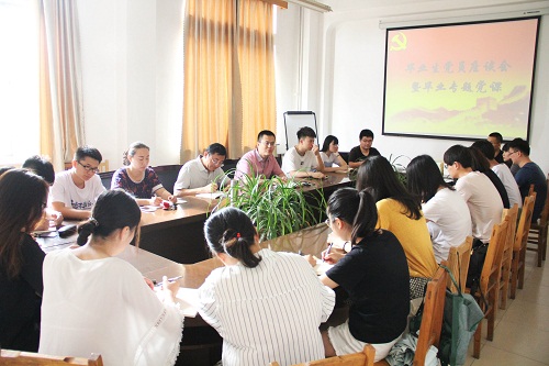6月22日上午,生命科学学院在13号教学楼248会议室举行毕业生党员座谈会暨毕业专题党课会议。会议由党总支副书记陆广峰主持,学院党总支书记郭万保,学生工作办公室主任、团总支书记李兰晶,辅导员蒋育忻、翟静涛以及14级全体党员共同参加。