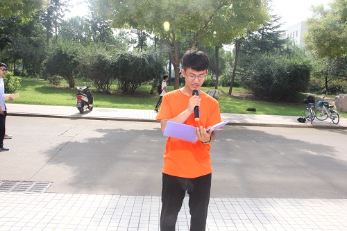 吴鹏在出征仪式发表讲话,他首先充分肯定了近年来学院社会实践所取得的成绩与成果,涌现出的以“太阳花”为代表的一批优秀服务团队,在全校取得良好的示范效果,并专门就本年度学校开展的以“穿越改革四十年,展现未来新希望”为主题的社会实践活动的意义做现场解读,同时希望大家能够不辜负学校、校团委对大家的殷切期望,真正通过实践活动去多关注国家社会发展动态,进一步了解国情民情现状,多做贡献,磨砺自我,收获成长。