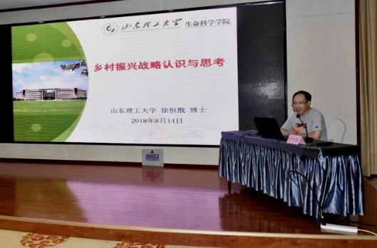 仪式上,与会人员还听取了生命科学学院生物工程系主任徐恒戬副教授所做的《乡村振兴战略认识与思考》的专题党课,徐老师结合个人认识理解和教学科研实践,从乡村振兴战略的提出、乡村振兴战略的实施、乡村振兴战略的主线和灵魂等方面,对国家和山东省实施乡村振兴战略的基本情况做了讲解。