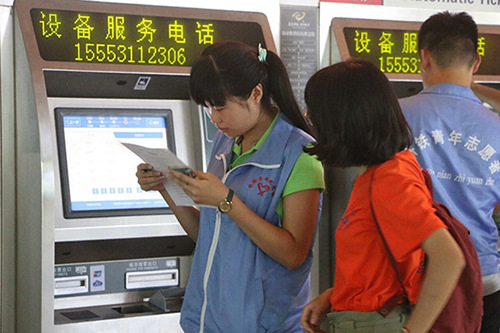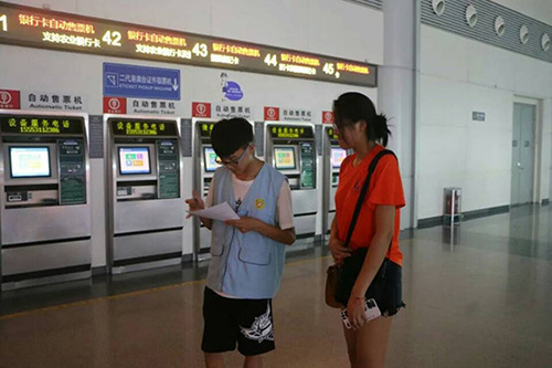 (图片三)火车站志愿者认真填写调研问卷(乔义旺摄)