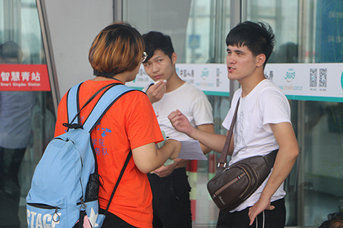 (图片二)火车站乘客热心与我们分享乘车经历(乔义旺摄)