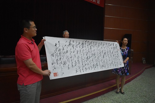 报告结束时,张福信向全体2018级新生赠送了他亲笔书写的书法作品——毛泽东同志的词《沁园春•长沙》,并引导在场学生齐声背诵,借以勉励“风华正茂”的“同学少年”珍惜大学时光,勤奋学习,刻苦专研,练就“到中流击水”的本领。