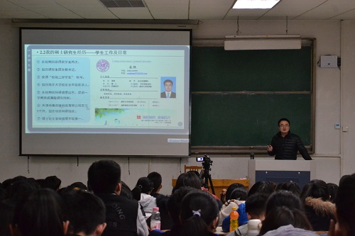 会议伊始,李兰晶向同学们简单介绍桑锋老师,并叮嘱同学们认真学习,从分享中学到经验,避免在未来道路上走弯路。随后,桑锋以大学生活为引,向同学们讲述自己的求学生涯,从大学毕业准备找工作,到决定考研,桑锋感触颇多。他说到:“你努力了不一定会成功,但你不努力一定不会成功。”回想自己的考研经历,桑锋也向同学们分享自己的几点建议与经验:一是明确的奋斗目标;二是积极向上的自信心;三是详细的复习计划;四是持之以恒的努力;五是良好的作息规律;六是目标一致的学习环境。此外,桑锋还向同学们讲述了硕博期间的求学经历以及在学校的工作经历,过程曲折,但丰富多彩。