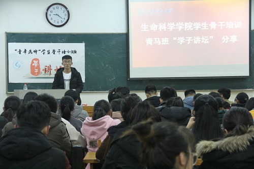 11月20日晚,生命科学学院在13号教学楼201教室举行生命科学学院学生骨干培训青马班“学子讲坛”分享会。此次分享会邀请到学生会主席李海峰,他以如何做一名合格的学生干部为主题展开讲解,部分学生会成员参加。