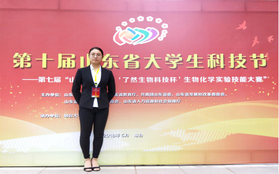 科研的目的就是探索她们未知的领域,了解她们不知道但是想知道的东西。正因为对科学研究的兴趣和执着,她从大一便加入了学院实验室,虚心学习,刻苦钻研,从最简单的工作开始做起,从对试剂的配制、精密仪器的操作和使用,到一步步自己动手完成小小的实验,到熟练运用软件处理实验数据、分析实验结果,再到认真严谨地完成每一项科技项目,在老师和师兄师姐的指导下,不断提高着自己的实验技能和动手操作能力。现已参与发表了2篇核心期刊论文;参加了2项国家级和1项校级大学生创新项目,其中两项在团队成员一起努力下均已结项;同时积极参加与各种科技活动比赛,希望在比赛中锻炼自己,提高自己,现已获第七届山东省大学生生物化学实验技能大赛省级特等奖,第九届山东省大学生生物学大赛省级一等奖;获“科技活动单项奖学金”,获2018年“学生科技创新先进个人”荣誉称号。