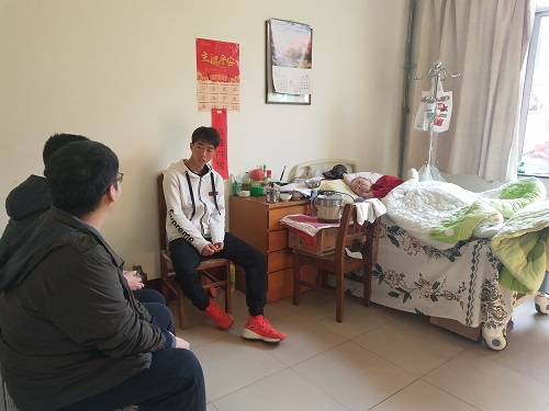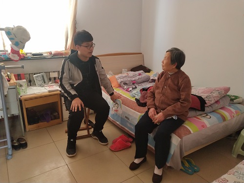 公寓老人们都非常热情,主动邀请志愿者到他们房间做客。其中,一位95岁高龄的奶奶牙齿都掉光了,耳朵听不清,讲话也不清楚,但还是在房间内对志愿者讲述自己的故事。她讲到,自己丈夫是一位干部,两个儿子都是党员。另外,她语重心长地嘱咐志愿者们要好好学习,要多做好事,争取入党,毕业后若是有机会就去当兵,为祖国争光。