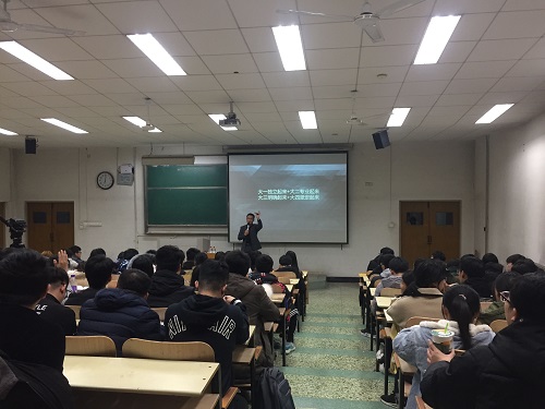 活动伊始,屈子千抛出一个耐人寻味的问题“回到起点我们应该做什么”,并提出 “一切美好,始于规划,一切规划,始于大一”的观点跟同学们互动交流,学生纷纷表达假如重新回到大一应该如何规划自己的大学生活。随后,屈子千解释了何谓“职业生涯规划”,他通过长期的调研发现,当代大学生对职业规划的认知分为四种状态:毫无概念、了解一点、比较熟悉和深入了解,大约76.6%的大学生对“如何规划自己的职业生涯”毫无头绪或仅有初步了解!并结合自身经历,紧紧围绕大学生活、入职创业等方面的生动案例说明就业规划的必要性和创业的艰辛不易,风趣诙谐的语言赢得了学生们的阵阵掌声。