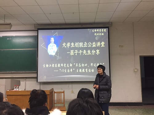 11月21日晚,生物工程系教师党支部在5号教学楼104教室开展“不忘初心、牢记使命”主题教育“为身边群众办1件实事好事”。此次活动面向2017级、2018级本科生开展大学生创业公益讲堂活动。生物工程系教师党支部联合院团总支学生科特邀济南青创大学生创就业服务中心理事长、国家二级职业指导师兼人力资源管理师屈子千主讲。生物工程系主任高秀珍,生物工程系教师党支部书记、系副主任刘红亮,团总支学生工作办公室李超和生物工程系教师党支部教师代表出席了本次活动。