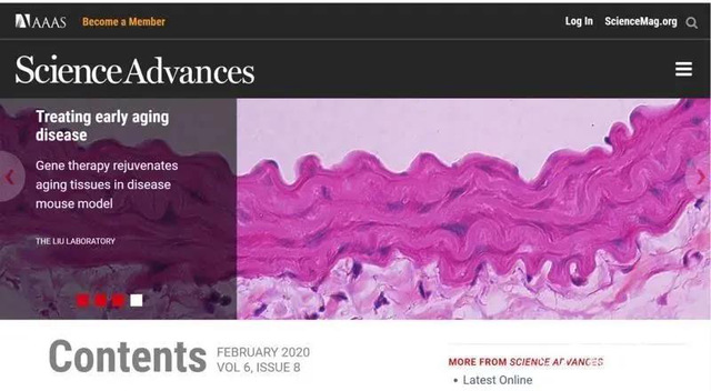 2020年2月 20日生命科学学院发育与免疫研究团队和抗衰老与再生医学研究所在国际著名综合性杂志Science子刊《Science advances》(影响因子:12.157, 1区Top)在线发表题为《Vascular endothelium-targeted Sirt7 gene therapy rejuvenates blood vessels and extends lifespan in a Hutchinson-Gilford progeria model》的研究性论文,同时该论文内容被选为本期滚动播放四个工作之一。