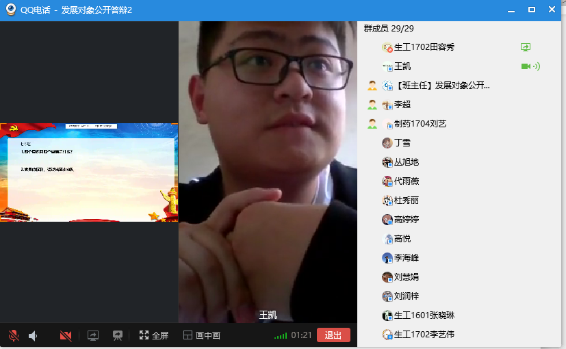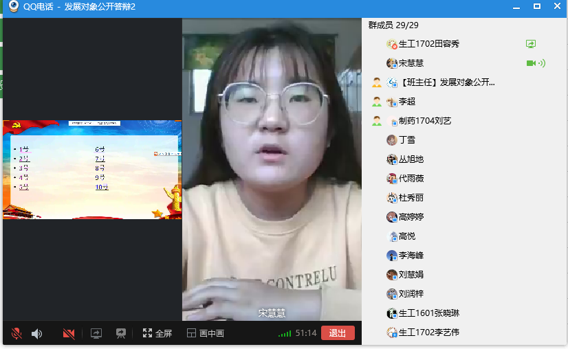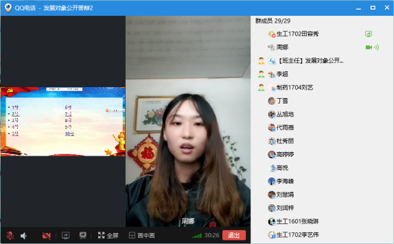 此次答辩分为个人陈述、现场答辩和自由提问三个环节。首先,由发展对象阐述自己对共产党的认识,袒露自己加入中国共产党的动机,汇报自己的思想、学习和生活当中的表现,表明自己入党的觉悟和决心。随后,从题库中抽取2道客观题和2道主观题,紧紧围绕着入党动机、党性修养、党的性质、权利、义务、原则等基本知识和习近平重要讲话学习等时事热点问题,检验发展对象对党的认识和基本理论知识的掌握程度。答辩者叙述完毕,与会党员结合发展对象自身进行提问,进一步考察答辩者的思想政治素质。答辩环节结束,参会党员线上进行表决。