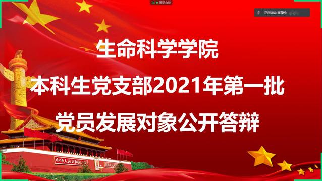 2月23日上午,生命科学学院本科生党支部召开线上2021年上半年党员发展对象答辩会,答辩会由生命科学学院本科生党支部书记蒋育忻同志主持,该支部全体党员及发展对象参与此次会议。