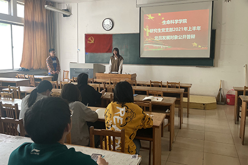 5月6日下午,生命科学学院研究生党支部在13号教学楼201教室举行2021年上半年党员发展对象公开答辩,会议由生命科学学院研究生党支部书记李兰晶同志主持,本次公开答辩应到党员13人,实到党员12人,因事因病请假1人,其中正式党员11人。