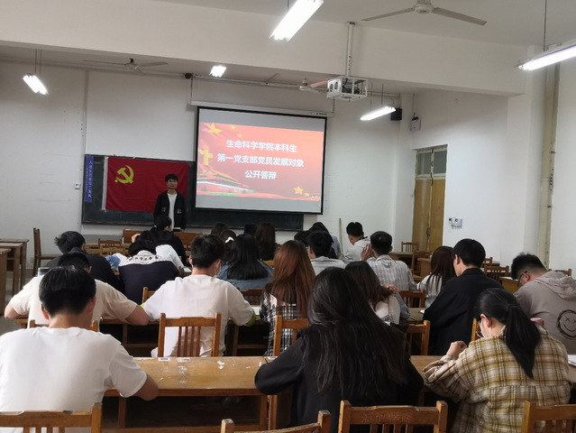 5月7日下午,生命科学学院本科生第一党支部在13号楼202教室召开2021年上半年党员发展对象公开答辩会,会议由生命科学学院本科生第一党支部书记蒋育忻同志主持,支部全体党员同志、预备党员及发展对象参与此次会议。