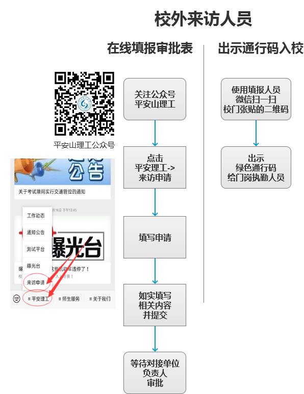 校外人员申请入校,须关注平安山理工公众号,填写来校重修课程并上传健康码等证明,来访时间根据课程及考试安排填写,对接单位选择教务处 教师教育学院,接待人员:学籍部,电话05332780393。