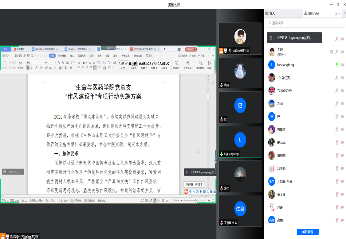 最后,陆广峰在总结中提到,2022年是学校“作风建设年”,要切实以作风建设为突破口,推进全面从严治党向纵深发展,通过作风大转变带动工作大提升、事业大发展。为进一步开展好“作风建设年”专项行动,他提出3点要求。一要做好传达部署,组织好学习。各支部书记、系主任要召开会议向全体教职员工、学生党员、学生干部传达通知要求,结合各类学习平台开展自学。各系要通过集中学习,不断引导师生深刻认识作风建设的重要意义和相关要求。二要做好结合文章,解决实际问题。领导班子和管理服务人员要深入把握排查整治的时间表和路线图,做好对照检查,制定整改清单,抓好落实。要与“亮身份、树榜样”党员示范带动工程结合起来,不断推动作风大转变,保障学院重点工作任务和党支部创品牌、党员亮行动顺利完成,解决制约学院高质量发展的共性问题。三要做好行动落实,力戒形式主义。要严格按照方案要求有序推进,从严从实抓好落实,坚决防止搞形式、走过场,确保各项任务落到实处,取得实效,以优良作风提升党建工作水平和特色强院建设实绩,为建设特色鲜明的高水平教学研究型大学贡献力量,以优异成绩迎接党的二十大胜利召开。