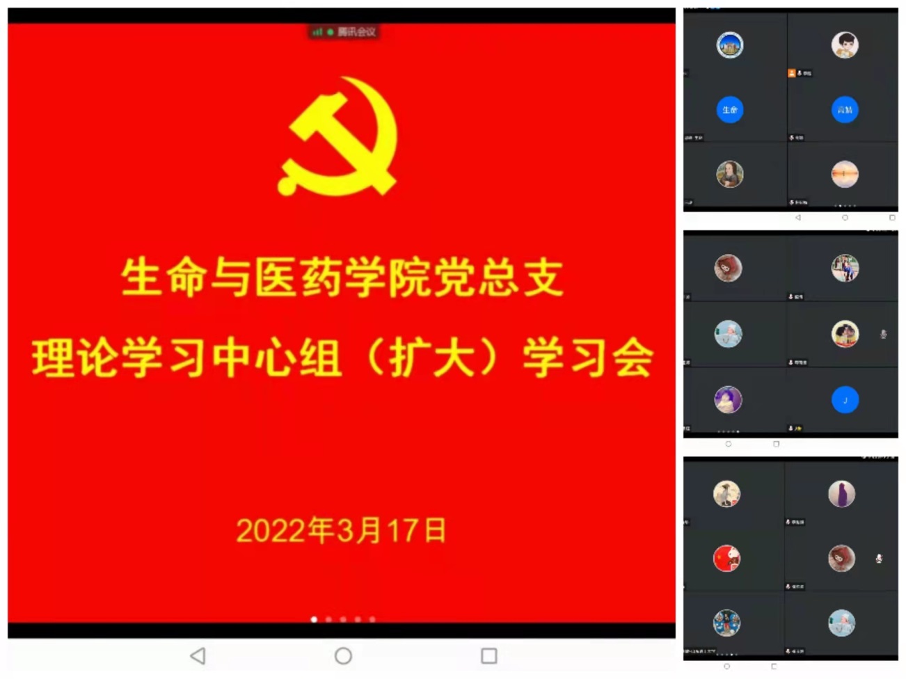 3月17日下午,学院党总支利用腾讯会议举行理论学习中心组(扩大)学习视频会议,学院党总支委员,教授委员会副主任,各党支部书记、委员,各办公室(中心)工作人员,各系主任、秘书参加会议。