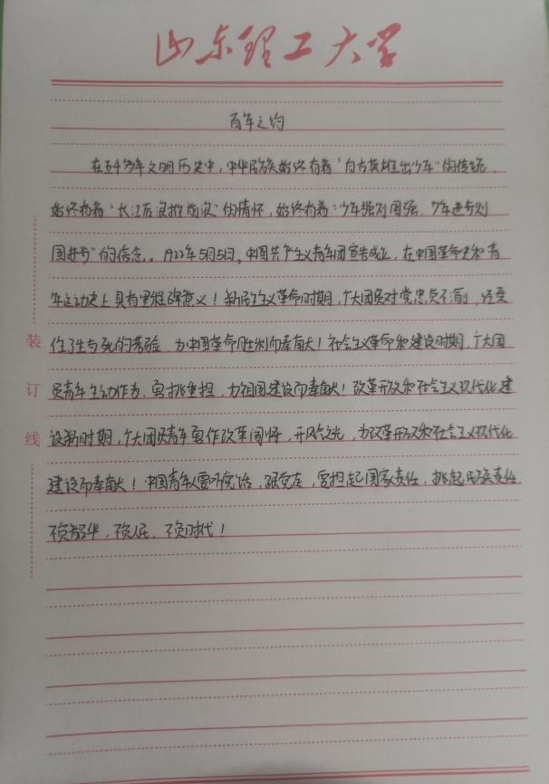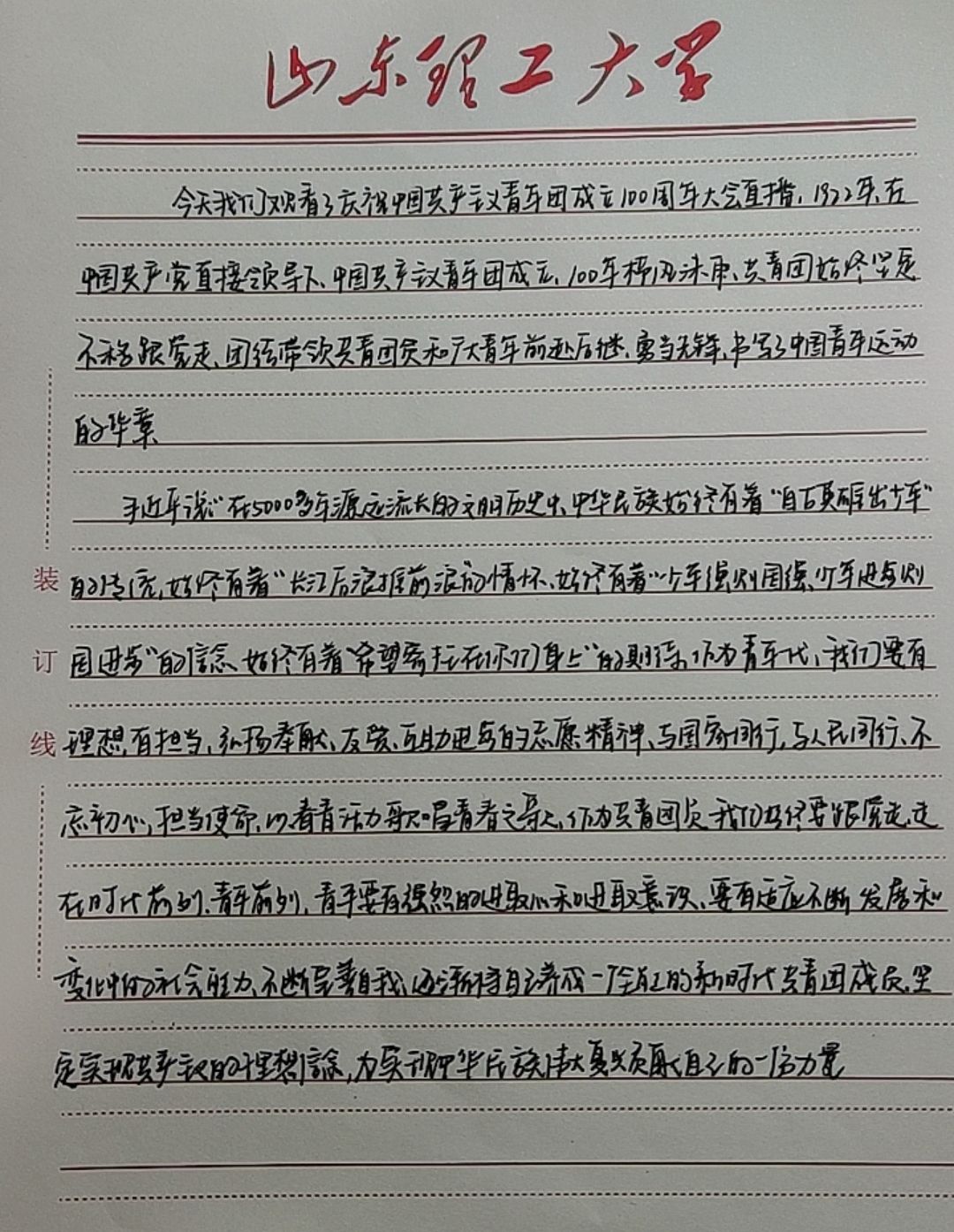 今天我们观看了庆祝中国共产主义青年团成立100周年大会直播。1922年,在中国共产党直接领导下,中国共产主义青年团成立。100年栉风沐雨,共青团始终坚定不移跟党走,团结带领共青团员和广大青年前赴后继、勇当先锋,书写了中国青年运动的华章。习总书记说,“在5000多年源远流长的文明历史中,中华民族始终有着“自古英雄出少年”的传统,始终有着“长江后浪推前浪”的情怀,始终有着“少年强则国强,少年进步则国进步”的信念,始终有着“希望寄托在你们身上”的期待。”作为青年一代,我们要有理想、有担当,弘扬奉献、友爱、互助进步的志愿精神。与国家同行,与人民同行。不忘初心,担当使命,以青春活力歌唱青春之歌。作为共青团员,我们要始终跟党走,走在时代前列,青年前列。同时,我们青年也要有强烈的上进心和进取意识,要有适应不断发展和变化中的社会的能力,不断完善自我,逐渐将自己培养成一个全能的新时代共青团团员,坚定实现共产主义的理想和信念,为早日实现中华民族的伟大复兴贡献自己的一份力量。