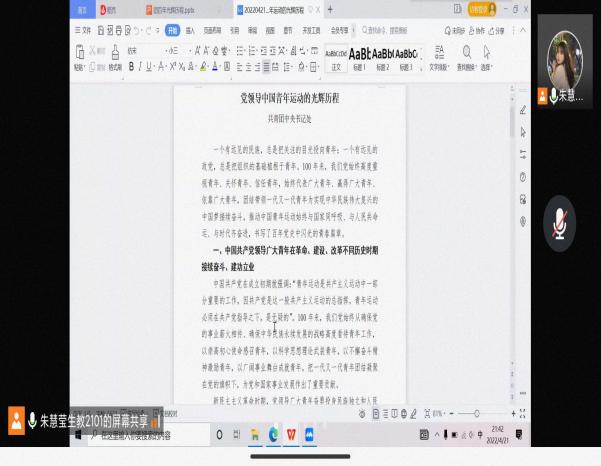 为了让同学们明确中国共产主义青年团的性质和创立过程,团支部通过开展线上会议,向同学们传达了“什么是中国共产主义青年团”、“中国共产主义青年团的性质”、“中国共产主义青年团的创立过程”,团支书带领同学们深入研读了共青团中央书记处下发的《党领导中国青年运动的光辉历程》文件,号召青年在实现中华民族伟大复兴中国梦的进程中不断开拓创新、奋发有为。