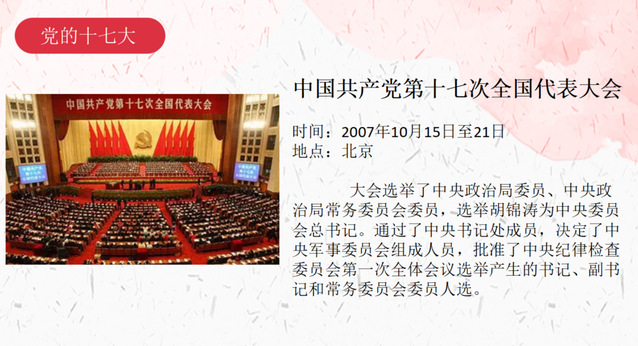 本次学习由崔帅帅作为党史主话人带领与会人员学习 “党的十六大、十七大、科学发展观”专题党史,本次学习主要学习党的十六大、十七大部分。崔帅帅首先介绍了澳门回归、神舟二号成功发射、申奥成功和南水北调工程等重大成就。然后,崔帅帅分别从大会主题、大会报告内容、历史意义方面详细介绍了党的十六大和十七大的基本内容。