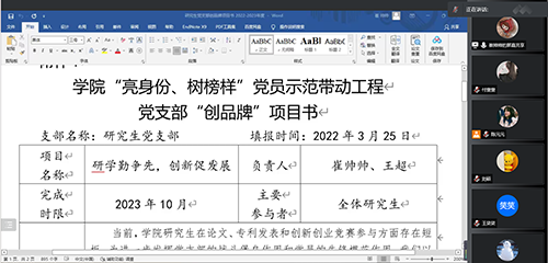 理论学习结束后,崔帅帅向与会党员同志介绍并讨论了“亮身份,树榜样”党员示范带动工程党支部品牌项目书,研究生党支部开展“研学勤争先,创新促发展”支部特色项目,面向全体研究生,旨在发挥研究生的科研带动作用,加强研究生之间的交流沟通,提升实验技能,提高研究生科研素质。