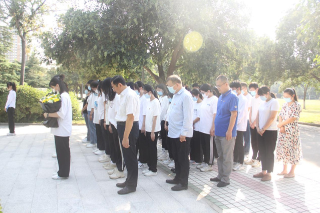 随后,全体党员肃立,为英勇献身的冯思广烈士默哀。默哀毕,党员代表田园、李龙琪敬献鲜花。