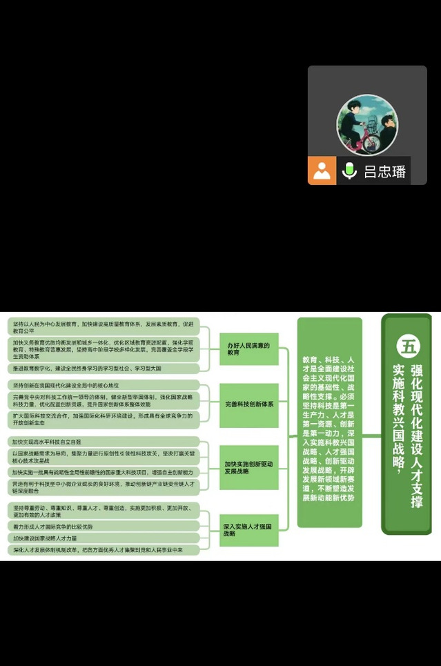 最后,吕忠璠老师带领全系教师,集体学习了党的二十大报告中的“实施科教兴国战略,强化现代化建设人才支撑”这部分内容,并围绕教育、教学、人才、创新等方面进行讨论。吕忠璠老师表示教师是太阳底下最光辉的职业,今后会以各位老师为榜样,以报告内容为不断学习的动力和方向,刻苦学习,砥砺品格,增长传道授业解惑的本领。
