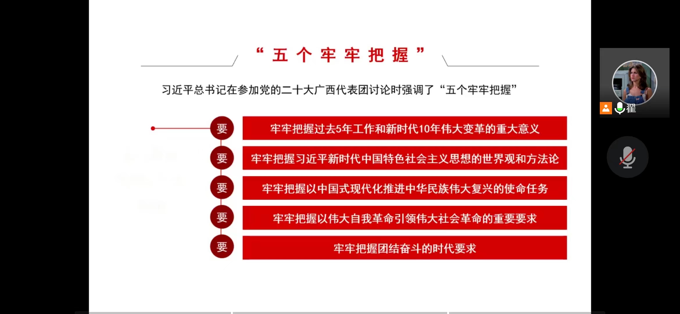 翟静涛简要说明了本次党课的学习目标和主要内容。介绍了党的二十大召开的时代背景,梳理了大会主题及深刻内涵,分享了大会的突出成果。通过进一步学习习近平总书记会上作的党的二十大工作报告,回顾了党和国家关于过去5年的工作和新时代10年的伟大变革,阐释了马克思主义中国化时代化“两个结合”的内在机理和把握习近平新时代中国特色社会主义思想的“六个坚持”要求,学习了关于中国式现代化的历史追溯和本质、“教育、科技、人才”“三位一体”安排重要意义等,并带领全体党员重温了报告中对全体党员和广大青年的具体要求和殷殷嘱托。
