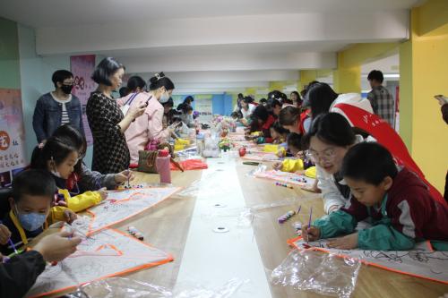 首先,社区工作人员将布坯、线轮、颜料与画笔等材料发放给小朋友和留学生,为大家讲解手绘风筝的步骤,冯思广精神学习研究会成员作为志愿者帮助青少年们绘画风筝。