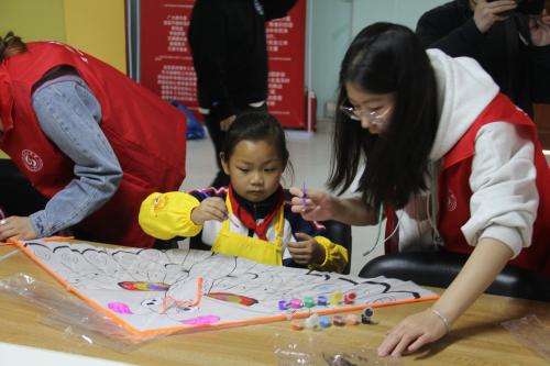 首先,社区工作人员将布坯、线轮、颜料与画笔等材料发放给小朋友和留学生,为大家讲解手绘风筝的步骤,冯思广精神学习研究会成员作为志愿者帮助青少年们绘画风筝。