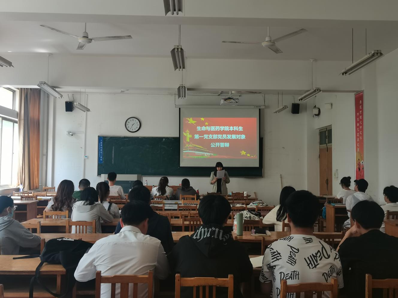 会议初始,党支部书记蒋育忻介绍此次会议的目的和流程,强调会议的纪律和严肃性,要求各位发展对象认真对待本次答辩。此次答辩分为个人陈述、现场答辩、自主提问、无记名投票四个环节。首先,由各位发展对象介绍自己的情况,阐述对中国共产党的认识以及入党动机,向党组织汇报自己思想、学习、工作等方面的表现。其次,从题库中随机抽取2道客观题和2道主观题作答,题目围绕入党动机、权利和义务等党的基本知识以及习近平总书记重要讲话精神等时事热点问题,检验发展对象理论知识的掌握程度。答辩者叙述结束,与会党员结合发展对象实际情况进行提问,进一步考察答辩者的思想素质。答辩环节结束,与会党员进行无记名投票,现场公布答辩结果。