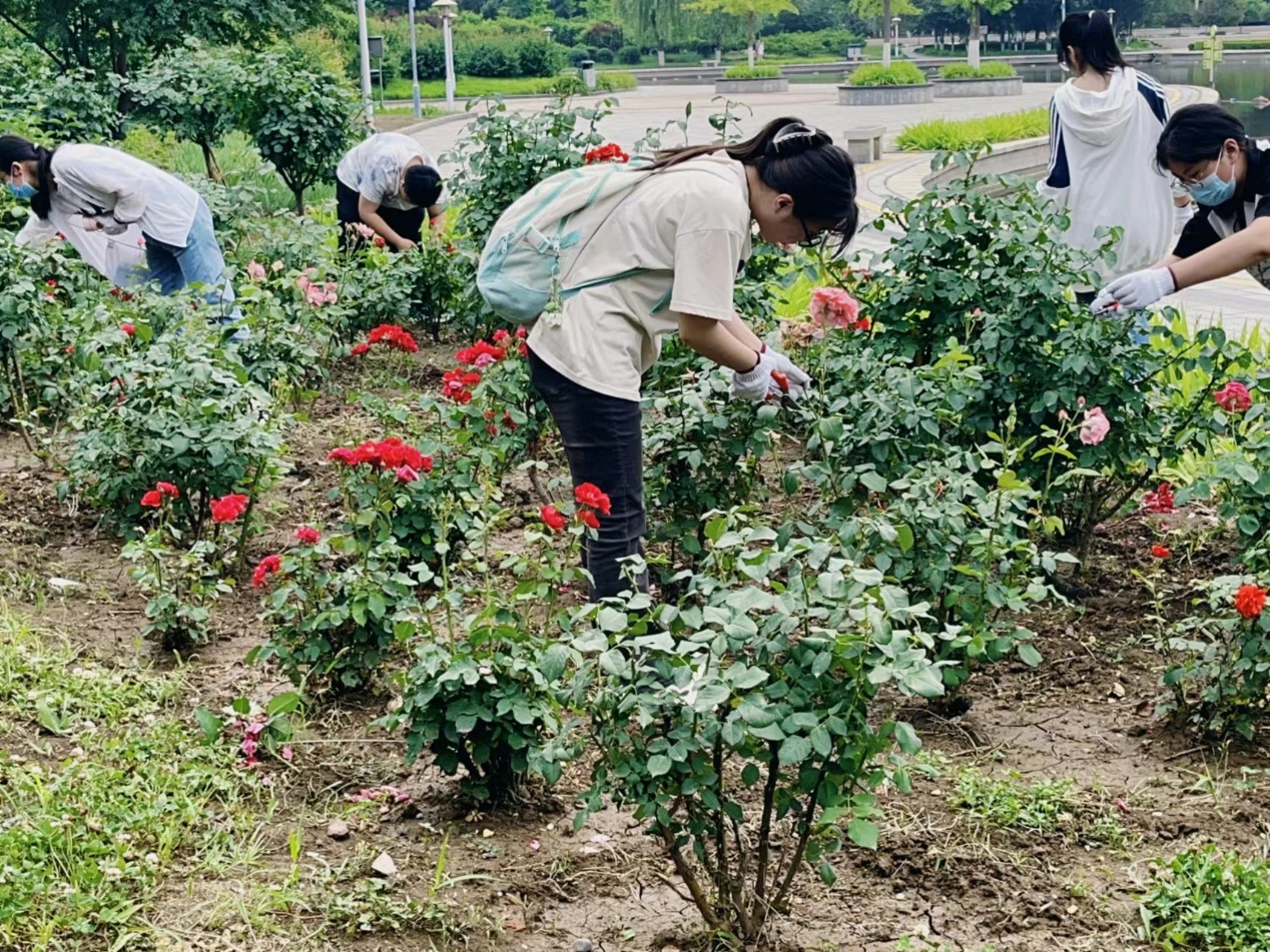 热烈的青春遇见热烈的花,同学们手拿修剪刀,弯腰俯身,一丝不苟地为月季花修建枝丫,将枯枝烂叶以及烂花及时摘除,保证植物生机盎然,预防病虫害,使月季花在外观上也显得更加美丽。