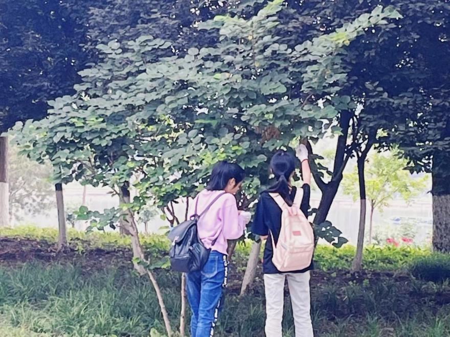 休息时间,两位同学根据这个学期所学的植物生物学知识,判断树的所属科种,叶、叶脉的类型,根、茎、叶的生长等。在劳动之余,将所学知识应用到实践中,活学活用。