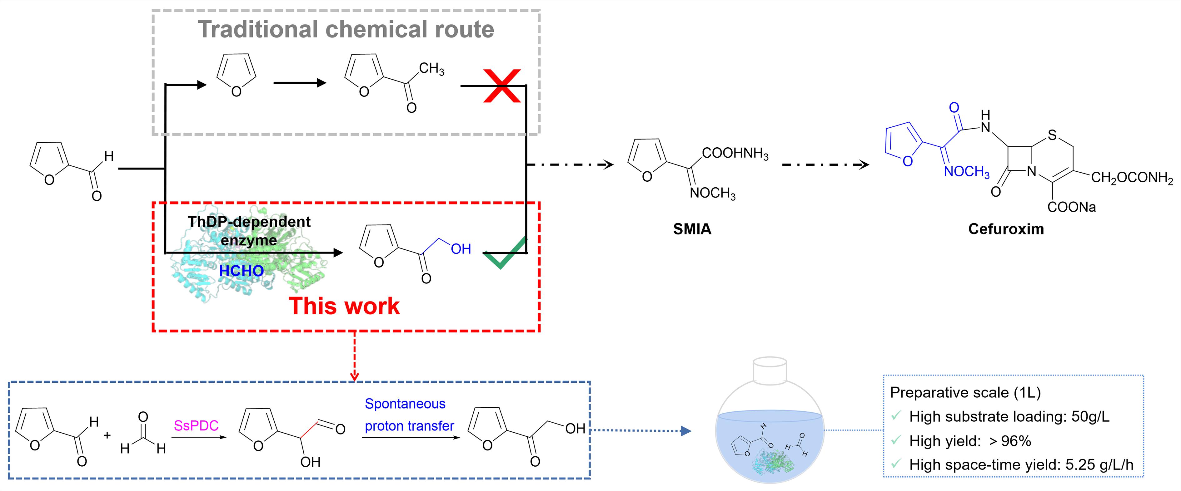 头孢呋辛是第二代头孢菌素类抗生素,主要用于感染性疾病的临床治疗。(Z)-2-甲氧基亚氨基-2-(呋喃基-2-基)乙酸铵盐(SMIA),是合成头孢呋辛的关键中间体之一。用于制备SMIA的主流商业路线是基于糠醛的化学合成,首先经过脱羰作用生成呋喃,然后进行乙酰化作用生成2-乙酰基呋喃,最后通过多步化学反应生成SMIA。传统化学合成由于高能耗、使用强酸、副反应等原因导致合成2-乙酰呋喃成本高昂,环境污染严重。与化学合成相比,生物合成方法反应条件温和,并表现出良好的选择性和高催化效率。
